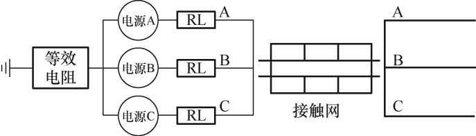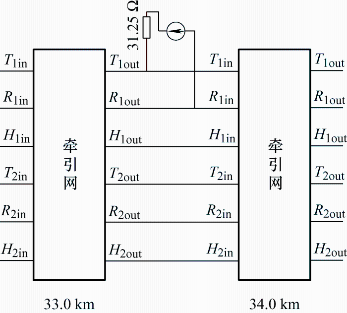 该模型将钢轨视为一条传输线路,使其能够与接触线、正馈线或回流线进行线路间的耦合。基于图1 ,针对出现弓网离线电弧时的整个牵引网建立等效模型,如图2 所示。基于图2 ,牵引变电所到负荷之间的牵引网线路采用了分布参数等值模型,由相同、多个π型等效集总参数模型串联组成。