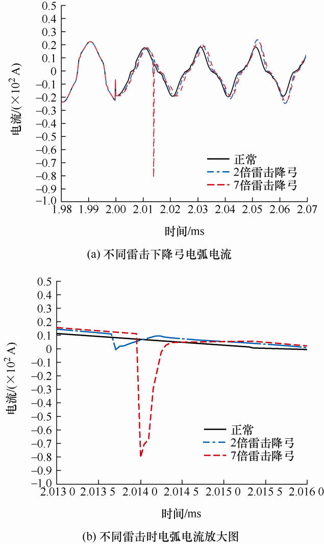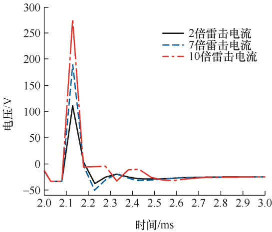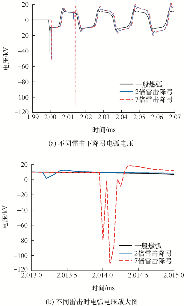 当降弓运动接近过零点时,等离子体通道的长度减少,导致通道的电阻增加,高压端的电流振幅减少。电流变化的速度变慢,从而导致过电压波动的振幅下降。最终在等离子体通道的电容增加和等离子体密度下降之间达到平衡,这种反馈回路导致电弧振荡。由于输入雷击电流增强电场,改变电荷分离与自由电荷速度,与高压端设备电感电容元件共同作用,不同倍数雷击电流的振荡恢复出现不同。