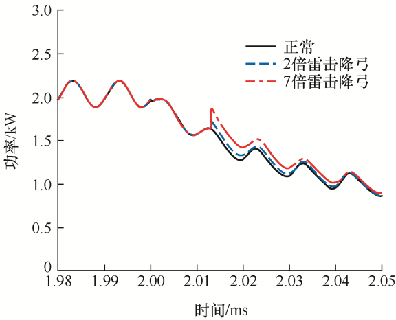 对雷击降弓时机车高压设备端功率情况进行分析,仿真结果如图12 所示,2.011~2.027 ms不同倍雷击电流降弓机车功率变化如表6 所示。