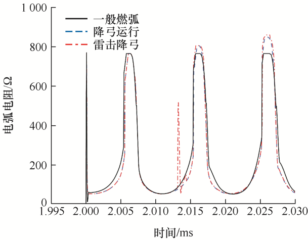 通过对比发现,降弓电弧相比于一般燃弧,电弧电阻会随着时间逐渐增大。雷击对于电弧电阻的增长影响不大,这是因为降弓运动会拉长电弧,导致电弧的电阻增大,而电弧电阻变化还要考虑形状、温度等因素,这些因素需要在较长时间内慢性地变化才能对电弧电阻有显著的影响,在短时间内输入电流也不会对电弧产生太大的热影响。当雷击发生时,等离子体通道中的电场增加,导致电子密度增加并形成燃烧电弧。这种电弧电流的增加伴随着电弧电阻的突然增加,随后由于更大的电弧通道打开,电弧电阻迅速减少。这种等离子体通道电阻突然增加和突然减少的反馈回路导致了电弧振荡,在输入雷击电流瞬间会出现电弧电阻突增,并以振荡形式快速衰减。