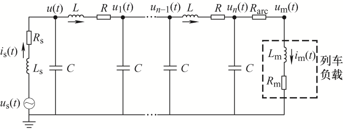 根据牵引网空间分布以及导体参数计算出牵引网电气参数,利用导线合并方法,将5 km单线牵引网等效为单位长度的T型电路,然后将其扩展为任意长度的牵引网线路模型。图2 中,牵引网模型由n 个R 、L 、C 构成的Ⅱ型部分串联构成,分别代表牵引网给定长度下的等效电阻、电感及电容;R m 、L m 分别为负荷等效电阻与电感;R arc (t )为电弧等值的非线性电阻模型;R s 、L s 分别为牵引变电所变压器等效电阻和电感;u s (t )为牵引变电所母线电压;un (t )为牵引网末端线路电压;u m (t )为受电弓弓头输入电压。