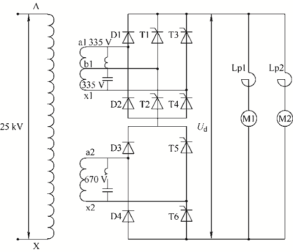 本文选用重型货运机车进行建模研究,其电力原理图如图3 所示。根据图3 所示主电路原理图,主电路仿真的主要组件包括牵引电源、主变压器、整流调压电路、平波电抗器、串励电动机等。其中,整流调压电路采用不对称不等分四段经济半控桥式整流电路。整流电路的晶闸管触发信号来自脉冲发生器模块,而串励电动机采用了一个等效模型来实现,即牵引电机总内阻串联反电动势。