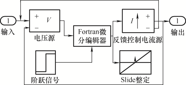 在电弧模型中,由于弓网间电弧的电阻为非线性动态电阻,而电弧模型不仅与牵引网参数有关,还与电弧黑盒模型选取有关。Mayr等效电弧模型主要适用于电流过零时的小电流情况,而Cassie电弧模型则适用于电流过零前的大电流燃弧情况。这两种电弧模型单独考虑都有一定的限制。Habedank等价电弧模型是Mayr电弧模型和Cassie电弧模型的结合并加以修正,能较好地反映电弧非线性特性。电弧模型由反馈控制电流源、Fortran微分编辑器、Slide整定值、阶跃功能、电压测量等模块组成。电弧模型的实现如图4 所示。