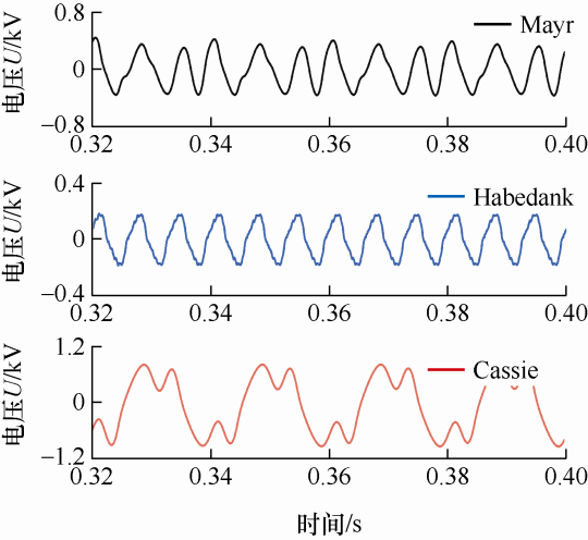 由图9 可知,与Mayr模型相比,Cassie模型表现出更陡峭的过电压峰值,导致了更严重的瞬变。然而,这两个模型都不包括明显的燃弧电压和灭弧电压。相比之下,综合动态Habedank模型清楚地显示了燃烧电弧和熄灭电弧,可以更准确地反映真实的电弧特性。Habedank模型通过电弧本身产生的电压和电流来实现这一点,能够更精确地模拟、分析和预测电弧的影响,如图10 所示。所构建的Habedank综合动态模型下的电压和电流波形与文献[18 ]中电弧试验波形一致,说明电弧的特征能够在综合动态模型中得到很好的显示。