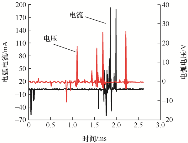 通过控制器设置不同的滑动速度(20~100 mm/s),当滑动过程中电弧产生时,用示波器同步测量出此时的电压和电流信号,每组数值进行12次试验,求取平均值,得到此时的电弧能量大小。在一定程度上,电弧能量的大小和变化能够反映电弧温度的大小和变化。通过智能运动控制器设定滑动速度在20 mm/s,一次触头间的滑动过程中,其电弧电流和电压变化如图10所示。触头在滑动过程中,由于触头间的振荡与冲击作用,使触头间发生短暂的离线,出现电弧放电的情况。