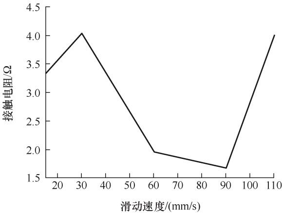 通过电压电流的数值计算得到接触电阻随滑动速度的变化,如图11所示。其中滑动速度为15~30 mm/s时,接触电阻增大,其原因是在这个速度段,电压变化幅度大于电流的变化幅度,电压占据主导地位;在滑动速度为30~90 mm/s时,接触电阻值下降,在起弧中电流慢慢占据主导地位,电弧的产生靠电流来维持。