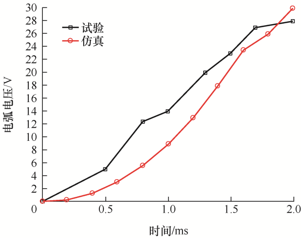 在电弧变化的2 ms内,试验的电弧电压从起弧至达到最大值,电压变化了28 V。同一试验电压下进行电弧仿真,在2 ms内电弧的电压变化了30 V。在滑动速度相同时,试验电弧电压和仿真电弧电压的变化基本一致,其对比如图12所示。
