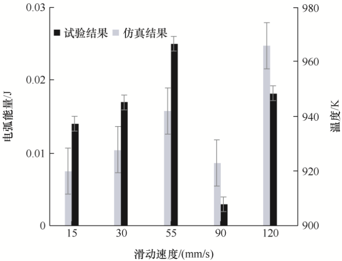 (3) 在滑动速度为55 mm/s时,触头之间的温度达到一个相对最高点,随后开始下降;在滑动速度90 mm/s处,温度达到最低,此后开始上升,在此过程中存在一个相对最优的滑动速度90 mm/s,该速度下电弧对触头的烧蚀最小。
