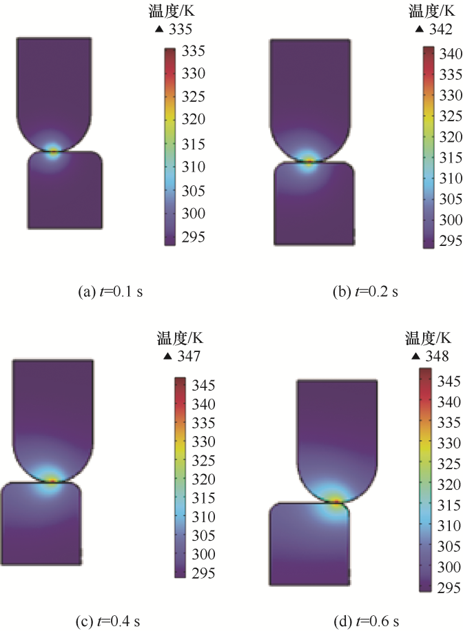 由图2可知,动触头表面的温度随着时间的增长而增大,在固定的距离内,温度从接触点向周围扩散,其最高温度出现在接触点处,形成一个高温区。其原因是随着运行时间的增加,触头接触面之间相互摩擦,摩擦力做功转化为热能,因接触电阻的存在,焦耳热也会随时间增长而增加,最终在电阻热和摩擦热的逐渐积累下,造成接触面的温度上升。