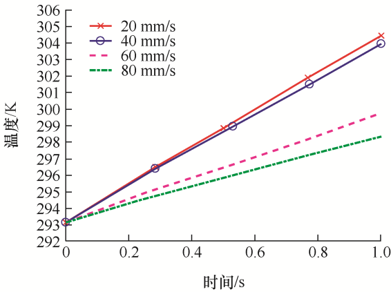 有载分接开关的开关触头尺寸有限,在忽略电弧热的情况下,在一定的距离之内滑动,其触头表面温度受滑动速度的影响很大,为探究在不同的滑动速度下滑动触头表面的温度变化,设置滑动速度分别为20 mm/s、40 mm/s、60 mm/s和80 mm/s,在不同速度下,动触头接触点的温度变化趋势如图3所示。