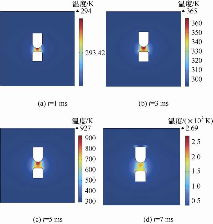 有载分接开关的开关触头在滑动过程中,不可避免地会产生电弧,在电弧的产生过程中,不同时刻其电弧的温度分布也会有所不同,电弧温度的大小与电弧能量密切相关,电弧温度的大小在一定程度上能反映电弧的能量大小以及电弧对触头表面的损伤程度。通过分析电弧的温度分布,可观察到电弧从起弧阶段到燃弧阶段的变化。其变化情况如图4所示,其中滑动速度为20 mm/s。