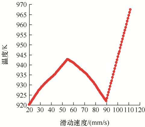 为进一步探究滑动速度对电弧温度分布的影响,在20~100 mm/s进一步细分速度值,测量动触头表面的温度变化,触头表面温度随滑动速度的变化如图8所示。可以发现,滑动速度从20~55 mm/s变化时,触头表面温度一直在上升,55~90 mm/s之间,触头表面温度开始下降,在90 mm/s之后温度又开始上升。由此可知,在滑动速度为55 mm/s时,存在一个相对的最高温度,滑动速度为90 mm/s时,触头表面温度最低,考虑到有载分接开关触头的运行效率和性能,与其他速度相比,此速度是最优的滑动速度。在此速度下,触头表面的温度值最低,电弧对触头表面的侵蚀程度最轻。
