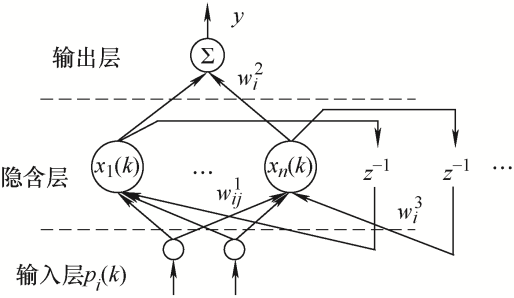 图2 中,$w_{ij}^{1}$ 、$w_{i}^{2}$ 、$w_{i}^{3}$ 分别为隐含层、输出层和承接层的权值;${{p}_{i}}(k)$ 为网络的输入,y 为神经网络的输出。
