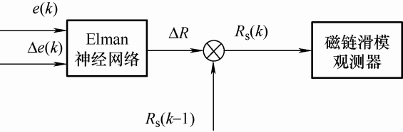 同时以电阻变化$\Delta R$ 为Elman神经网络的输出。由图3 可知将神经网络的输出加上电阻上一时刻的值,就可以得到辨识的电阻值,然后将其用于磁链滑模观测器的设计。