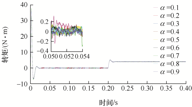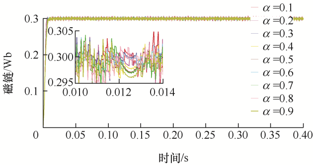 根据李雅普诺夫稳定性判据可知,滑模控制器的稳定性条件是构造一个李雅普诺夫函数V ,且满足$\dot{V}\le 0$ 。由以上分析可知当${{\dot{V}}_{1}}\le 0$ 时,即基于转矩误差设计的分数阶全局滑模控制器满足稳定性条件。同理当$\mathop{{\dot{V}}}_{2}\le 0$ 时,即基于磁链误差设计的分数阶全局滑模控制器满足稳定性条件。