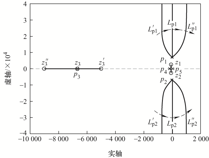 由式(12)计算得到,当K i /K p =6 666.6时,z 3 与p 3 重合;当K i /K p >6 666.6时,z" 3 位于p 3 左侧;当K i /K p <6 666.6时,z' 3 位于极点p 3 右侧。将对应三种PI参数代入式(10),可得根轨迹曲线如图3 所示。其中L p1 、L p2 ,L' p1 、L' p2 ,L" p1 、L" p2 分别受z 3 、z' 3 、z" 3 影响并以p 1 、p 2 为起点。由图3 可知,当K i /K p >6 666.6时,系统不稳定;当K i /K p =6 666.6时,系统临界稳定;当K i /K p <6 666.6时,系统稳定,此时根轨迹曲线位于左半平面,为最小相位系统。