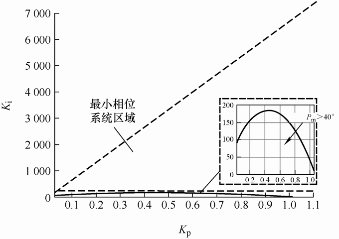 ... 期望相位裕度P m ≥40°[11 ] ,结合最小相位系统稳定约束K i /K p <6 666.6,绘制PI参数取值范围如图4 所示.在图4 所示最小相位系统内,取P m ≥40°箭头所示区域作为本文所提方法的PI参数稳定域. ...