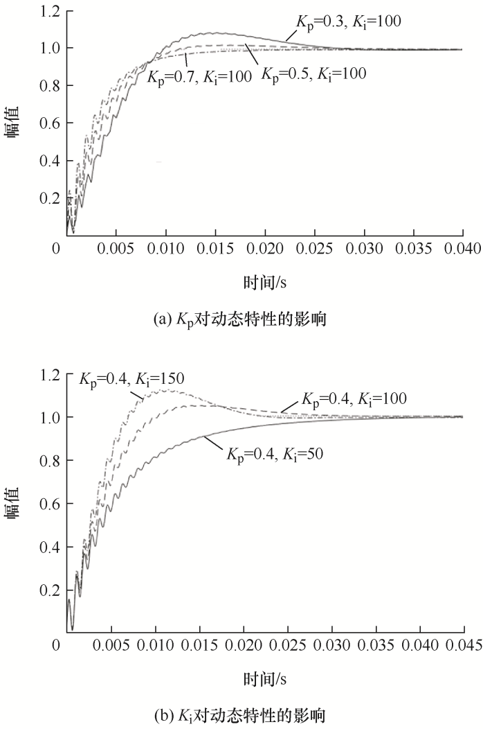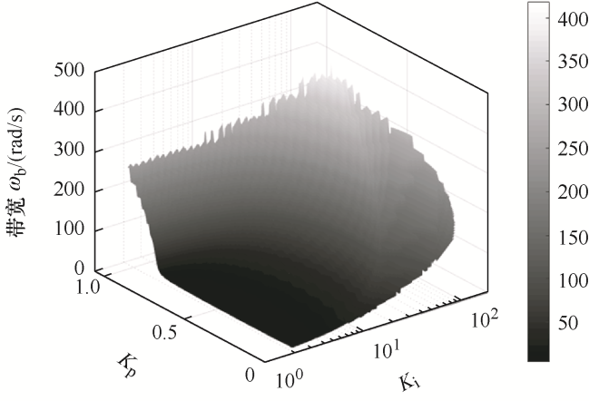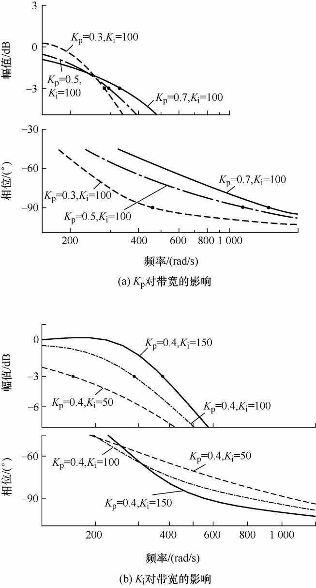 图8b 为K p 不变时K i 对带宽的影响,可见,带宽随K i 的增大而增大,结合图6b 可知,带宽越大,系统响应速度越快,上升时间和调节时间越小,超调量大。因此,可通过调节PI参数,使系统具有较大的带宽,进而提高系统响应速度,获得较小上升时间t r 和调节时间t s 。