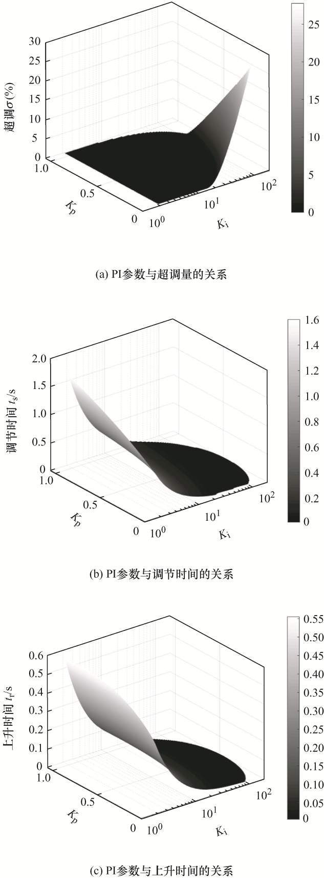 在图4 所示P m ≥40°区域内,选取三组K i 相同、K p 不同和K p 相同、K i 不同的PI参数,由式(16)绘制单位阶跃响应曲线如图6 所示。可见,当K i 不变时,σ %、t s 和t r 均随K p 增大而减小;当K p 不变而K i 增大时,σ %随之增大,t s 和t r 随之减小。绘制PI参数与动态性能指标的三维关系如图7 所示,结合图6 可见,K p 越小或K i 越大时,σ %越大,t s 和t r 越小。