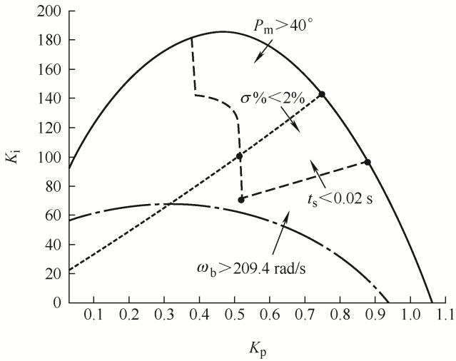 绘制满足上述性能要求的PI参数范围如图9 所示。其中,四个标记点所围成的四边形区域即为满足上述性能要求的约束区域,也是PI参数多目标寻优的取值范围。