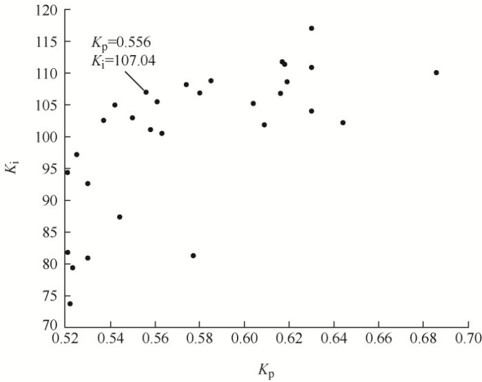 步骤3:遗传算法寻优。在图9 所示PI参数多目标约束范围中,配置种群规模为30,应用式(19)对种群中个体进行评价,将性能好的个体保存到下一代,两次迭代之间数据交叉概率取为0.8,变异概率取为0.2,迭代500次。遗传算法寻优得到的PI参数解集如图10 所示,其对应的优化目标数值构成图11 所示Pareto前沿。根据图10 和图11 ,考虑超调量小、谐振峰小和闭环带宽大的需求,本文选取K p =0.556,K i =107.04作为PI控制器参数,该取值可使系统有较小超调(σ %=0.83)和较小谐振峰值(M r =32.7 dB)及较大带宽(ω b =358 rad/s),从而保证系统良好的综合性能。