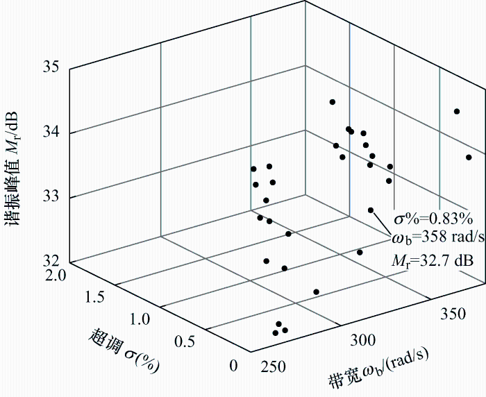 由以上分析可知,前置滤波器电机系统的带宽与动态性相关,高带宽系统响应速度快、调节时间t s 和上升时间t r 短,从动态性能角度可选取带宽ω b 作为优化目标,以扩展电流环带宽提高系统的动态响应[21 ] 。超调量σ %单独作为优化目标之一。同时,为了降低谐振峰值减小高频电流谐波,将谐振峰值也作为一个优化目标。