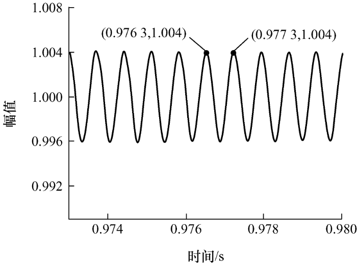 应用传统Ziegler-Nichols法设计本系统参数,如图12 所示,当调节临界比例度K c =1.5时,系统临界振荡周期T c =0.001 s。由经验公式K p =0.45K c 、K i =K p /0.833T c 可得K p =0.675,K i =810.3。