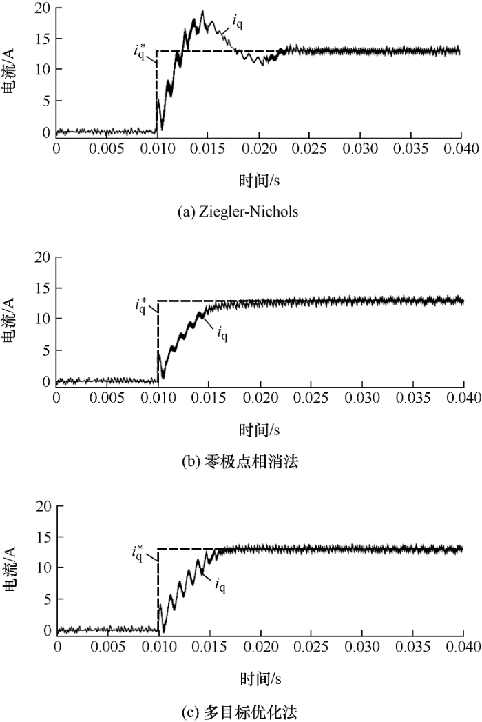 验证三种设计方法系统稳态和动态性能如下。图15 给出了q 轴给定13 A电流阶跃响应仿真波形。由图15 可见,不同参数系统均具有良好稳态性能。Ziegler-Nichols法的系统响应速度快,上升时间为2 ms,但超调量过大,约为33.33%,且调节时间长达16 ms。零极点相消法的超调量基本为0,但动态性能差,响应速度慢,t r =7 ms,t s =13 ms。多目标优化方法基本零超调,相较于零极点相消法响应速度也大大提升,t r =6 ms,t s =7 ms。上述指标与表2 相符。