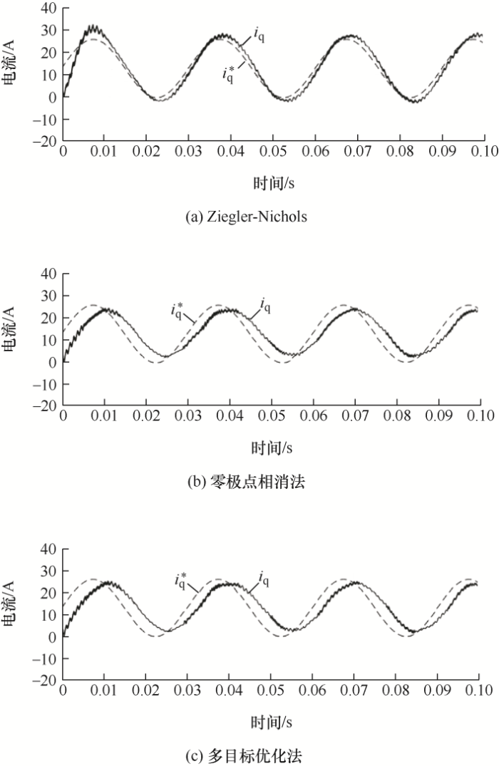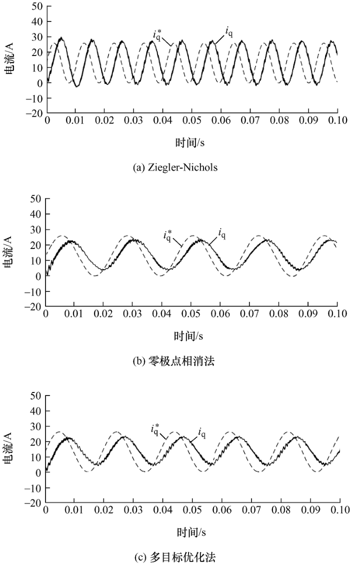 验证三种方法系统电流环跟踪性能如下。q 轴正弦给定幅值13 A、频率33.33 Hz (对应500 r/min),电流响应如图17 所示。可见,Ziegler- Nichols法可准确追踪给定信号,幅值几乎无衰减,跟踪延迟小(约为0.49 ms),对应相位滞后5.91°。零极点相消法的系统带宽最小,跟踪电流幅值衰减约2 A,约占给定幅值的15.3%,跟踪延迟约为2.99 ms,对应相位滞后35.99°。多目标优化方法中电流幅值衰减约1.49 A,占给定幅值的11.5%,跟踪延迟约为2.49 ms,对应相位滞后29.99°,优于零极点相消法的跟踪性能。