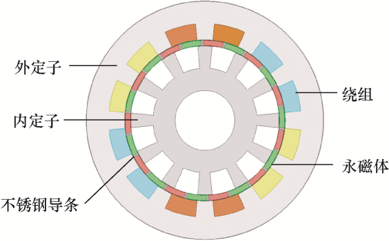 近年来,为提高永磁游标电机的功率因数,提出多种拓扑结构,双定子结构己经被证明是一种有效提高永磁游标电机(Permanent magnet vernier machine,PMVM)功率因数的措施[13 ] 。与单定子永磁游标电机相比,双定子结构通过提高气隙的调制磁场和降低电枢主电感,达到高转矩密度和高功率因数的目的。采用双定子结构必然存在双层气隙,使漏磁现象加剧,而高温超导体(High temperature superconductor,HTS)的发现,给这一问题的解决提供了新思路。文献[14 ]定量比较三种双定子磁通调制永磁电机的电磁性能,即游标电机、引入高温超导块材的游标电机和磁齿轮电机,结果表明高温超导块材不仅可以提高游标电机的调制效果,还可以显著减少漏磁。