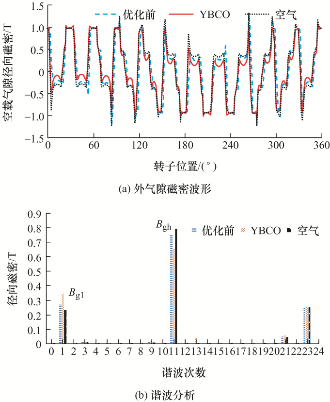 谐波分量$Bg1$ 和$Bgh$ 分别为调制磁密和永磁体基波磁密,优化前DSPMVM的$Bg1$ 幅值为0.27 T,$Bgh$ 幅值为0.75 T。优化后的DSPMVM-HTS的$Bg1$ 幅值为0.34 T,$Bgh$ 幅值为0.65 T,与优化前相比永磁体基波磁密降低了约13%,而调制磁场磁密增加约25.9%。将YBCO更换为空气时,$Bg1$ 的幅值为0.23 T,$Bgh$ 的幅值为0.78 T,与优化前相比永磁体基波磁密约提高4%,调制磁场磁密降低约14.8%。而游标永磁电机的有效磁负荷公式可表示为