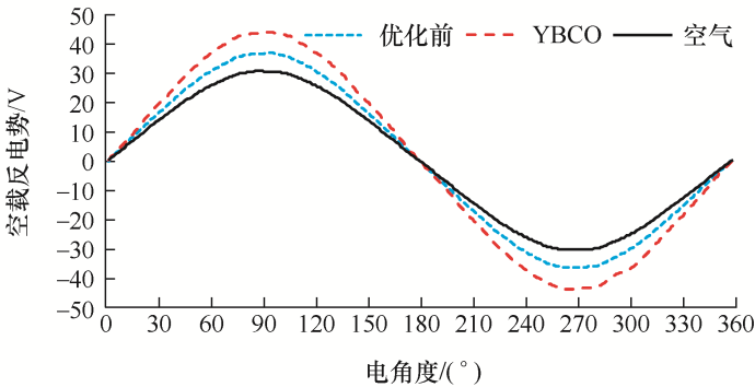 (1) 对优化前后三种双定子永磁游标电机模型进行电磁分析,在内定子侧引入高温超导块材料后,电机的空载反电势比原模型提高了19.82%,相较于填充空气时提高了37.44%。负载情况下的负载转矩比优化前提高了20.71%,比填充空气时提高了27.02%。内定子侧引入高温超导块材料后,漏磁明显下降、负载转矩明显提高,同时也使得加载情况下磁通分布的不平衡加剧,导致负载转矩波动较其他两种模型大。