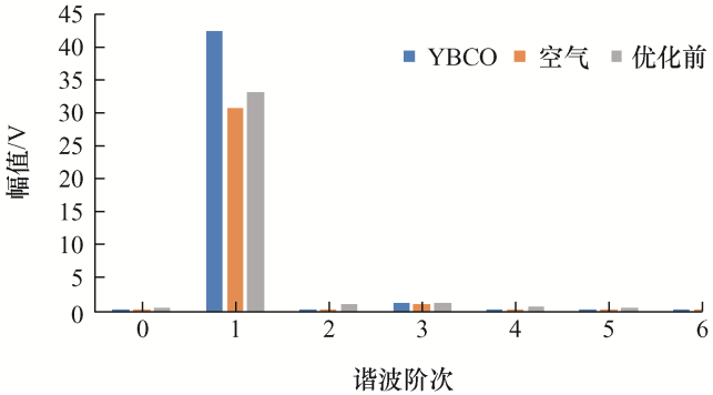 对空载反电势进行谐波分析,如图11 所示。对比分析三种模型下空载反电势的谐波幅值,可见一次谐波所占比例最大。对比优化前、优化后填充空气或YBCO三种情况下的电机模型,其幅值分别为33.3 V、30.9 V和42.5 V。综合以上电磁分析,加入YBCO材料后电机的性能相比于其他两种情况电机的性能得到显著提升。