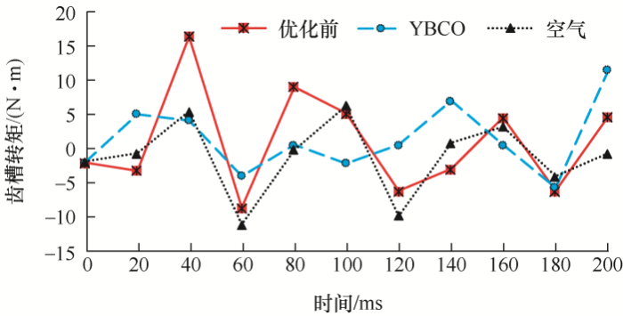 齿槽转矩大小直接影响电机性能,如噪声、振动和转矩波动,因此对电机进行电磁分析时,齿槽转矩也是需要关注的重点。如图12 所示为200 ms内优化前、优化后填充YBCO和优化后填充空气三种模型下的齿槽转矩,优化前的齿槽转矩最大有效值为7.64 N·m,优化后填充YBCO材料和空气时其有效值分别为4.65 N·m和5.07 N·m。尽管三种模型下的齿槽转矩都在可接受范围,但优化后的齿槽转矩比优化前更小。