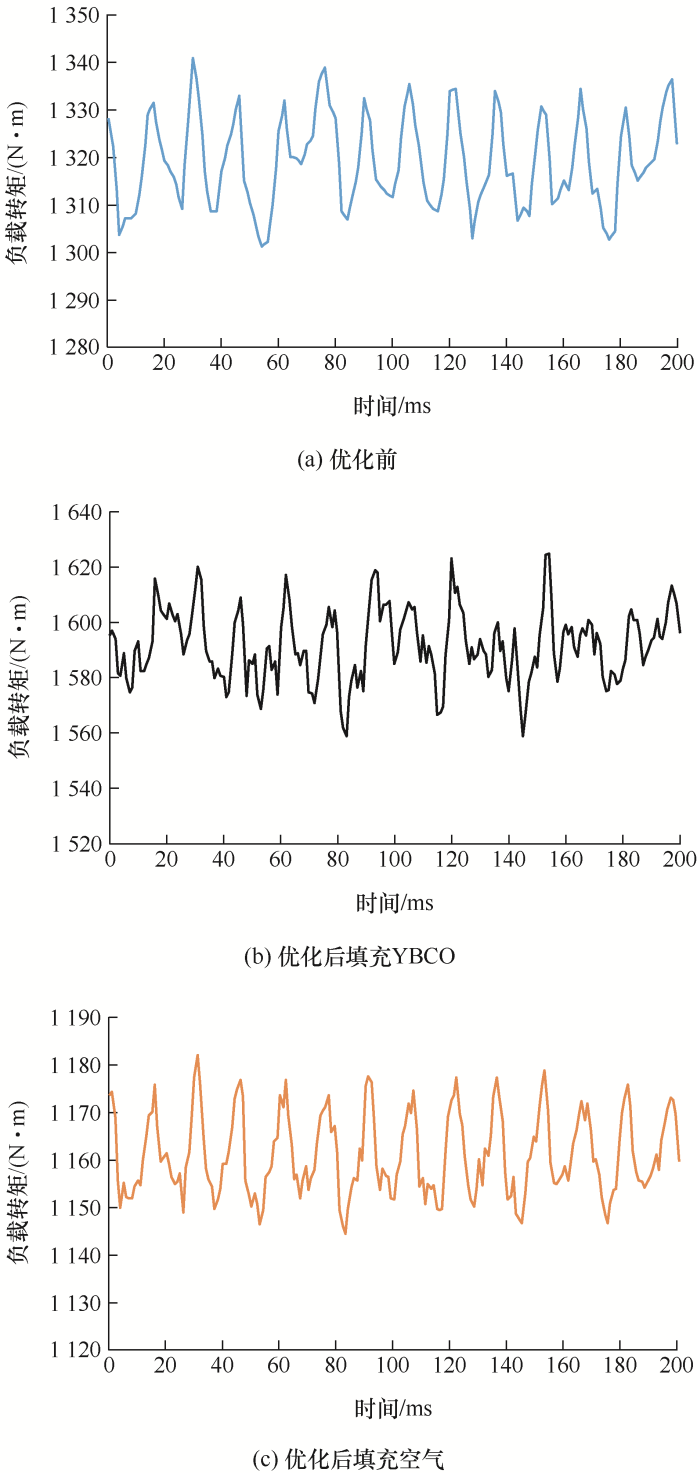 优化前、优化后填充YBCO和优化后填充空气三种模型下电机负载特性如图13 所示,负载转矩平均值分别为1 318 N·m、1 591 N·m和1 161 N·m。填充空气时其负载转矩最低,与优化前相比较降低11.91%,而填充材料为YBCO时,其负载转矩相较于优化前有显著提升,比优化前负载转矩提高20.71%。在引入高温超导块材料后加载情况下虽然其负载转矩可以显著提升,其对应的负载转矩脉动相较于其他两个模型也较大,这源于加载情况下引入的高温超导块材增强了内定子侧的磁通分布,扩大了气隙中磁通分布的不平衡。
