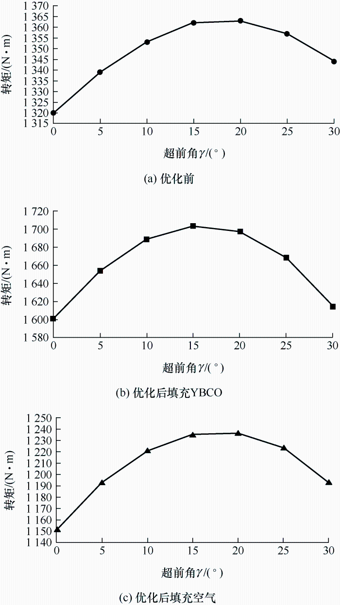 式(14)表明电磁转矩与空载反电势和有功电流分量有关,电流超前角影响电磁转矩。对优化前后的模型分别用电流模拟施加负载,γ 为所加相电流和空载反电势之间的夹角。优化后的电机模型具有更大的转矩输出,由图14a 可得转矩优化前的模型其转矩在超前角在20°附近可取最大值,具体数值需要更详细的角度分析。以电流超前角为20°对应负载转矩为例,其负载转矩较电流超前角为0°时提高3.26%。从图14b~14c 中可知,优化后的模型分别填充YBCO和空气时,其负载转矩最大值分别在15°与20°附近取到,对应负载转距分别较电流超前角为0°时的负载转矩相应提高6.37%与7.38%。