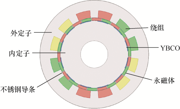 双定子永磁游标电机的结构如图1 所示[15 ] ,其外定子侧有12个槽被用于放置整距单层绕组。转子部分由矫顽力较高的永磁体(NdFeB)和不锈钢导条共同组成,NdFeB磁体共11对极采用径向充磁方式,不锈钢导条置于永磁体间用于隔离。内定子具有与外定子相同的开口槽系数和齿槽轴线,且内定子侧未放置绕组仅用于调制磁场。由于该电机结构存在漏磁严重的问题,为减少漏磁提高永磁体的利用率,在其内定子侧引入高温超导块材料。选择可承受高磁场高温的超导陶瓷材料钇钡铜氧(YBCO),处于超导状态时具有完全抗磁性,磁力线将不会穿过其内部,该块材料通过改变磁路的状态达到减少漏磁的目的。利用参数化分析,优化位于内定子侧YBCO的尺寸,综合考虑确定其具体参数后的电机结构如图2 所示。该电机主要参数如表1 所示。