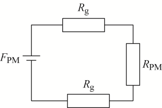 (5) ${{\phi }_{\mathrm{m}}}=\frac{{{F}_{PM}}}{{{R}_{PM}}+2{{R}_{g}}}=\frac{{{B}_{r}}{{h}_{PM}}{{r}_{g}}{{\theta }_{PM}}{{L}_{a}}{{R}_{g}}}{{{h}_{PM}}+2{{R}_{g}}{{\mu }_{0}}{{\mu }_{PM}}{{r}_{g}}{{\theta }_{PM}}{{L}_{a}}}$