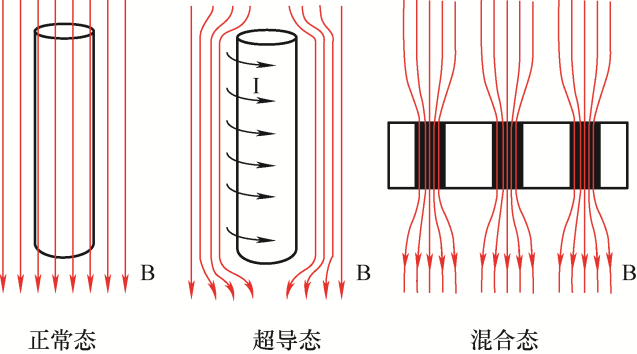 本文选用的高温超导陶瓷材料为YBCO,其处于超导状态时具有完全抗磁性,与所施加磁场的先后顺序无关,仅与其所处温度有关。如图5 所示为不同状态下高温超导材料对外加磁场的响应,处于混合态时其电阻为零,但不具备完全抗磁性,部分磁场穿过其内部以涡旋的状态存在,涡旋的中心不超导,其余部分依然处于超导态。因此在利用其完全抗磁性时,需要使YBCO满足处于超导态的条件,若处于混合态或正常态则不具备全抗磁性,不能满足使用要求。