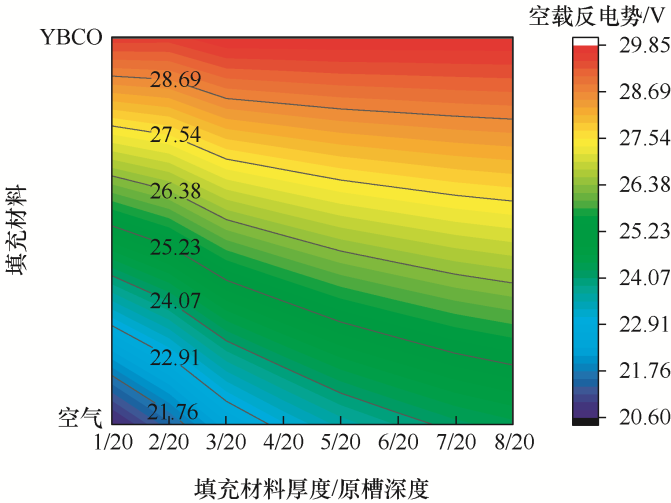 采用分层优化方法,对高温超导块材料尺寸进行优化。在高温超导材料块宽度不变的情况下对其厚度进行优化。对所建立的有限元模型进行参数化分析,结果如图6 所示,优化前内定子槽的深度为59.5 mm,当高温超导块材厚度达到优化前齿槽深度的1/20(2.975 mm)时,其空载反电势的有效值为29.55 V,空载反电势受高温超导块厚度的影响很微弱。综合考虑高温超导体所受的磁感应强度和屏蔽效能,对于高温超导体的厚度选择为3 mm[17 ] 。更换填充材料,将填充材料由YBCO替换为空气时,其空载反电势下降明显,其反电势幅值随内定子槽深度增加而升高,但与填充高温超导材料块相比空载仍有较大差距。