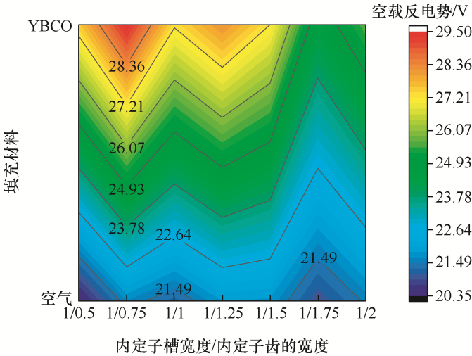 在对高温超导材料的厚度优化之后,确定高温超导材料的厚度为3 mm,在保持高温超导材料块厚度不变的情况下,对其宽度进行优化。结果如图7 所示,空载反电势的幅值受槽宽度影响波动较大,内定子侧槽中填充不同材料时,其空载反电势也有较大差距,但整体的波动趋势并未受到填充材料影响。在所取的数据中空载反电势在内定子槽宽度与内定子齿宽度比值为1∶0.75时取到最大值,对应空载反电势有效值为29.49 V。相同条件下采用优化前的内定子槽宽与内定子齿宽比值为1∶0.6时,其空载反电势有效值为29.55 V,因此优化后的模型内定子侧槽宽与齿宽比值保留优化前的1∶0.6。