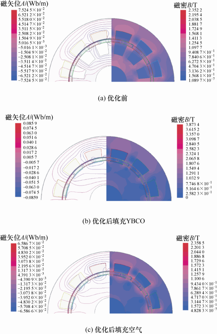 有限元分析可以获得比等效磁路法更高的计算精度,建立模型时需要将高温超导材料的参数设置为超导状态,因此将其磁导率设置为零;还需要考虑到定子的磁饱和问题,定子材料参数源于实际硅钢片DW465-50。如图8 所示为双定子永磁游标电机的有限元分析模型,其定子轭部均较厚,空载状态下磁通密度都很低。对比可见优化后内定子侧引入高温超导块材料,磁力线将不会穿过高温超导块材料,定子齿部会有更多的磁力线穿过用于产生力矩,高温超导块材料附近的磁场强度较高。将YBCO块材用空气替换后,部分磁力线可直接穿过空气形成回路,其磁通密度显著降低,漏磁现象加剧。