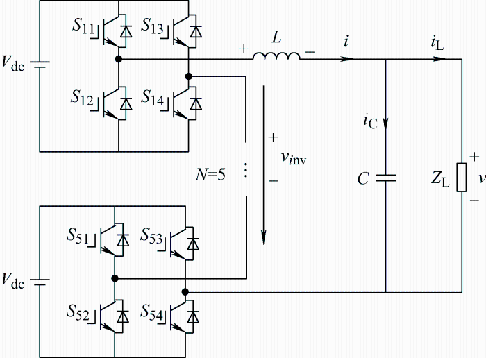 单相级联H桥五单元逆变电源的拓扑结构图如图1 所示,该拓扑是由5个独立的级联H桥单元和LC滤波电路组合而成。图1 中Sij 为带续流二极管的级联H桥逆变器的桥臂。单个H桥单元的直流供电电压均为V dc ,L 为滤波电感,C 为滤波电容,Z L 为负载阻抗。级联逆变桥输出方波电压为${{\nu }_{i\text{nv}}}$ ,逆变器输出电压为5个级联H桥输出电压的叠加之和,经LC滤波器后输出电压和输出电流分别为$\nu $ 、 ${{i}_{\text{L}}}$ 。