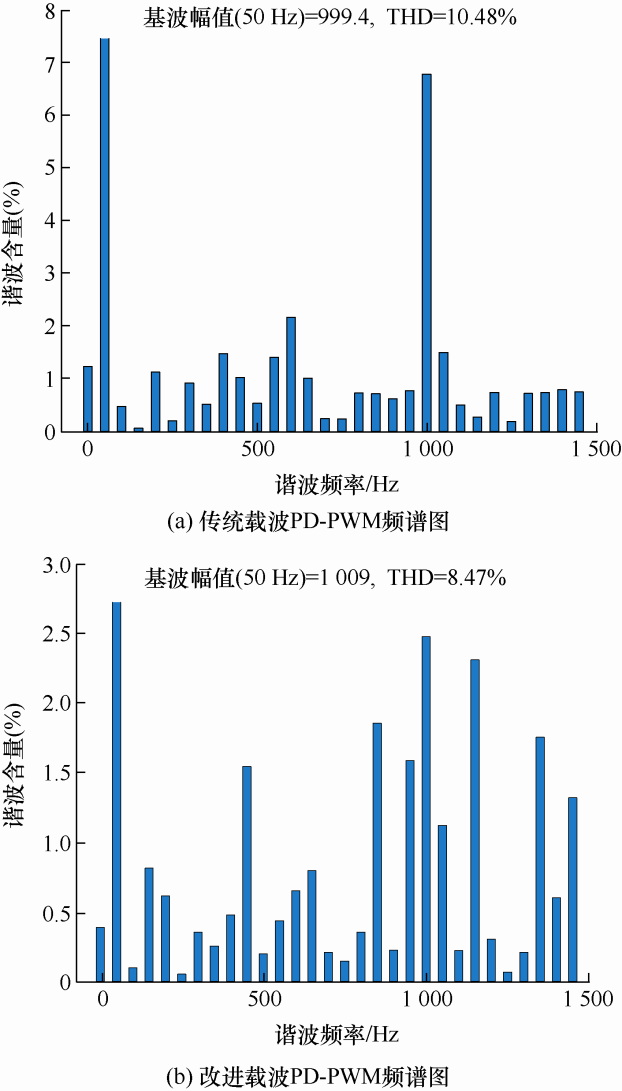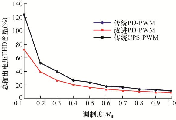 图11 所示为在${{M}_{\text{a}}}$ =1,${{M}_{f}}$ =20条件下传统三角载波与所采用的改进三角载波PD-PWM调制的逆变器输出电压频谱对比图;图12 为CHB逆变电源采用传统PD-PWM、改进PD-PWM调制和传统CPS-PWM调制技术时,输出电压THD值随调制度变化的对比曲线图。由图11 和图12 可知,所提改进载波PD-PWM调制可以在全调制度范围内降低输出电压波形的THD含量,在${{M}_{\text{a}}}$ =1,${{M}_{f}}$ =20条件下提高了基波电压值含量,验证了所提改进载波移幅调制策略的可行性。