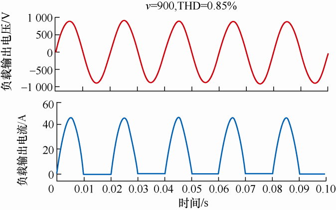 为了验证所提改进三角载波PD-PWM调制算法和所提控制策略的可行性,根据图9 搭建了输出功率等级为20 kV·A单相级联H桥大功率逆变电源仿真模型。相关参数设置如下:级联H桥直流侧电压V dc =200 V,输出负载电压峰值为900 V (AC)/50 Hz,电感L =1.06 mH,电容C =2.65 μF,等效开关频率f sw =60 kHz。外环调节器的PI参数:k p1 =0.2,k i1 =0.4;内环调节器的P参数:k p2 =0.010 6。