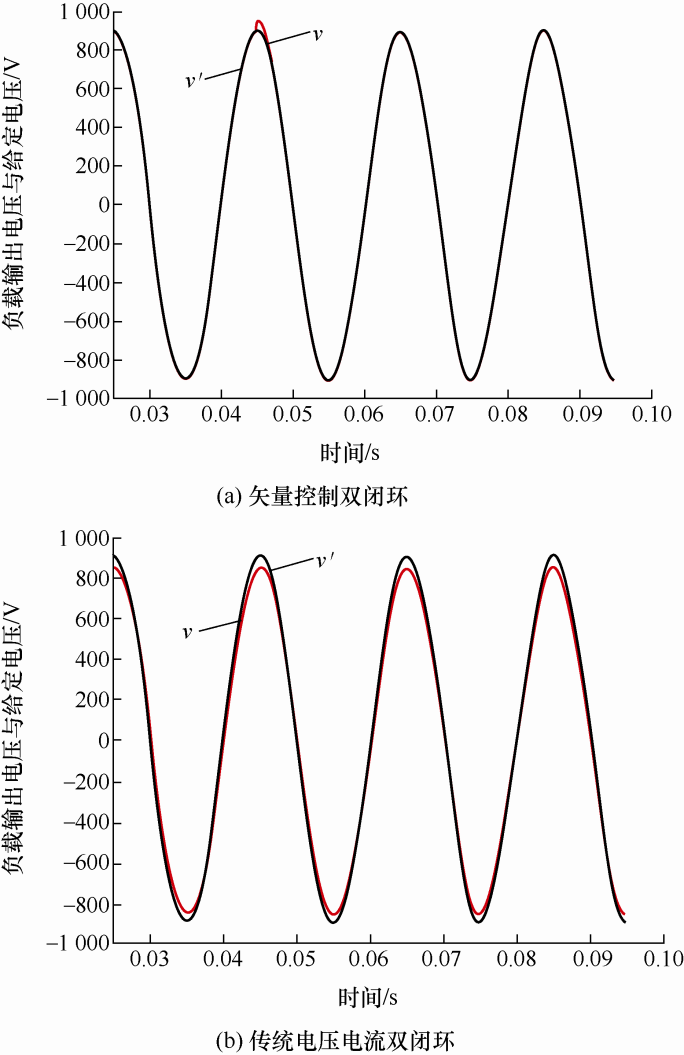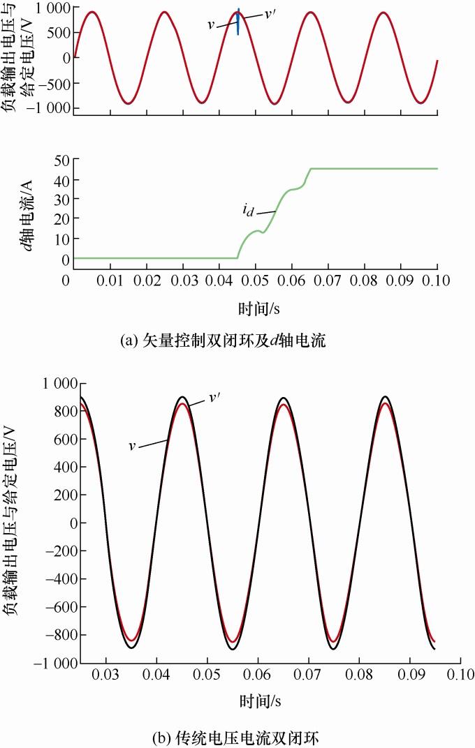 逆变电源在0.045 s时刻由空载阶跃变为20 Ω的情况下,所提矢量控制与传统电压电流双闭环仿真波形对比,以及d 轴负载电流波形变化如图14 所示。由图14 可以看出,采用传统电压电流双闭环控制策略时,输出电压与给定电压存在一定的差值,差值为12 V,而所提控制策略在负载突变时仍然能够较好地跟踪目标电压,没有静差。
