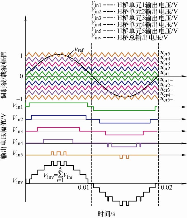式中,i 为级联H桥单元的序号数,则级联逆变桥输出方波电压${{\nu }_{i\text{nv}}}$ 可以表示为