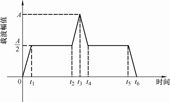 (11) $C\text{(}t\text{)=}\left\{ \begin{align} & \frac{t}{{{t}_{\text{1}}}}\text{(}\frac{A}{\text{2}}\text{)}\quad \quad \quad \quad \quad 0\le t<{{t}_{\text{1}}} \\ & \frac{A}{2}\quad \quad \quad \quad \quad \quad {{t}_{\text{1}}}\le t<{{t}_{\text{2}}} \\ & \frac{t-{{t}_{\text{2}}}}{{{t}_{\text{3}}}-{{t}_{\text{2}}}}\text{(}\frac{A}{\text{2}}\text{)+}A\text{/2}\quad \ \ {{t}_{\text{2}}}\le t<{{t}_{\text{3}}} \\ & \frac{{{t}_{\text{4}}}-t}{{{t}_{\text{4}}}-{{t}_{\text{3}}}}\text{(}\frac{A}{\text{2}}\text{)+}A\text{/2}\quad \ \ {{t}_{\text{3}}}\le t<{{t}_{\text{4}}} \\ & \frac{A}{2}\quad \quad \quad \quad \quad \quad {{t}_{\text{4}}}\le t<{{t}_{\text{5}}} \\ & \frac{t-{{t}_{\text{6}}}}{{{t}_{\text{5}}}-{{t}_{\text{6}}}}\text{(}\frac{A}{\text{2}}\text{)}\quad \quad \quad \ \ {{t}_{\text{5}}}\le t<{{t}_{\text{6}}} \\ \end{align} \right.$
