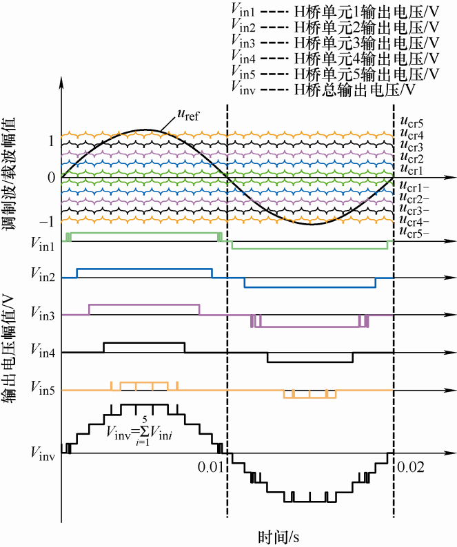对于图1 所示的5单元11电平逆变器,PD-PWM的原理如图2 所示。由图2 可知,调制共需要10个频率、幅值、相位完全相同的三角形载波与正弦参考信号进行比较,以生成正弦PWM信号。当参考信号大于载波信号时,则与该载波信号相对应的功率器件接通,级联单元i 对应的载波u cri+ 与u cri- 对称分布于时间轴两侧;u ref 为正调制波。多电平总输出电压为5个级联H桥功率单元输出之和的叠加,其示意图如图2 所示。