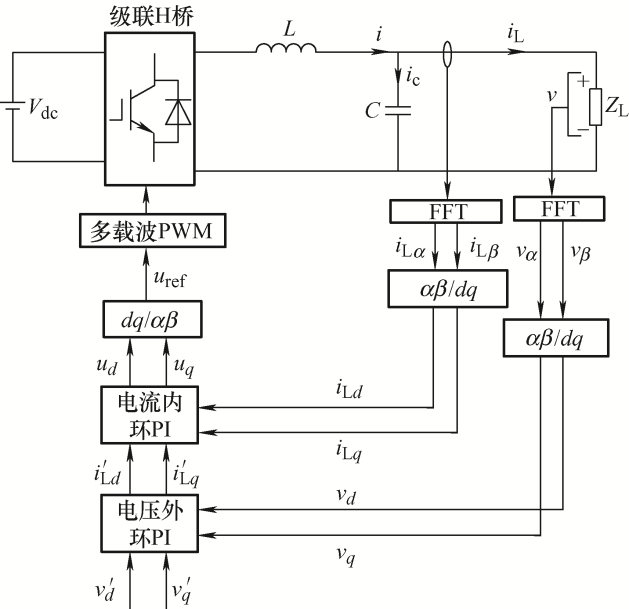 通过傅里叶变换,采用旋转坐标变换矩阵来建立单相级联逆变电源完整的矢量控制系统。